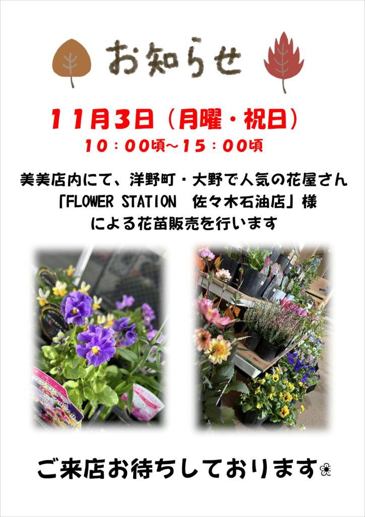 2025年10月28日 / 最終更新日時 : 2025年10月28日 nicoa-Shop-user news 美美よりお知らせ 11月3日(月)美美店内にて 洋野町・大野の「FLOUR STATION 佐々木石油店」様による 花苗販売を行います! 皆様のご来店を心よりお待ちしております。 Follow me! FacebookXBlueskyHatenaCopy コメントを残す コメントをキャンセルメールアドレスが公開されることはありません。 ※ が付いている欄は必須項目ですコメント ※ 名前 ※ メール ※ サイト 次回のコメントで使用するためブラウザーに自分の名前、メールアドレス、サイトを保存する。 上に表示された文字を入力してください。